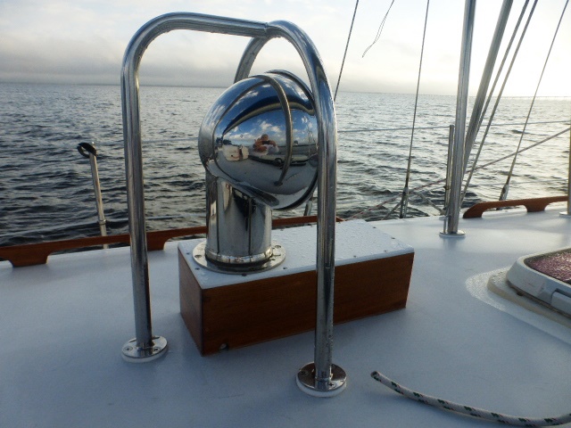 | The weather did not behave according to the forecast. We left the dock just ahead of a front. A double reefed main and half reefed jib still has us flying down the bay. |